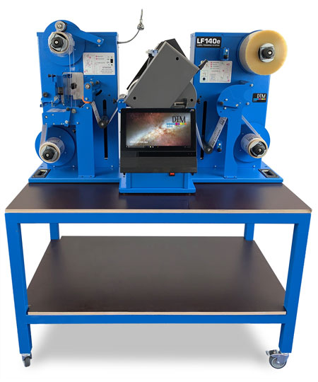 DTM LF140e with a mounted 11.6’’ touch screen PC, LED light, built-in camera on a steel table with 2 solid wooden 15 mm multiplex panels + OKI Pro1050 with Shuttle PC for OKI Pro Series and RW-7 Label Rewinder on a steel table with 2 solid wooden 15 mm multiplex panels