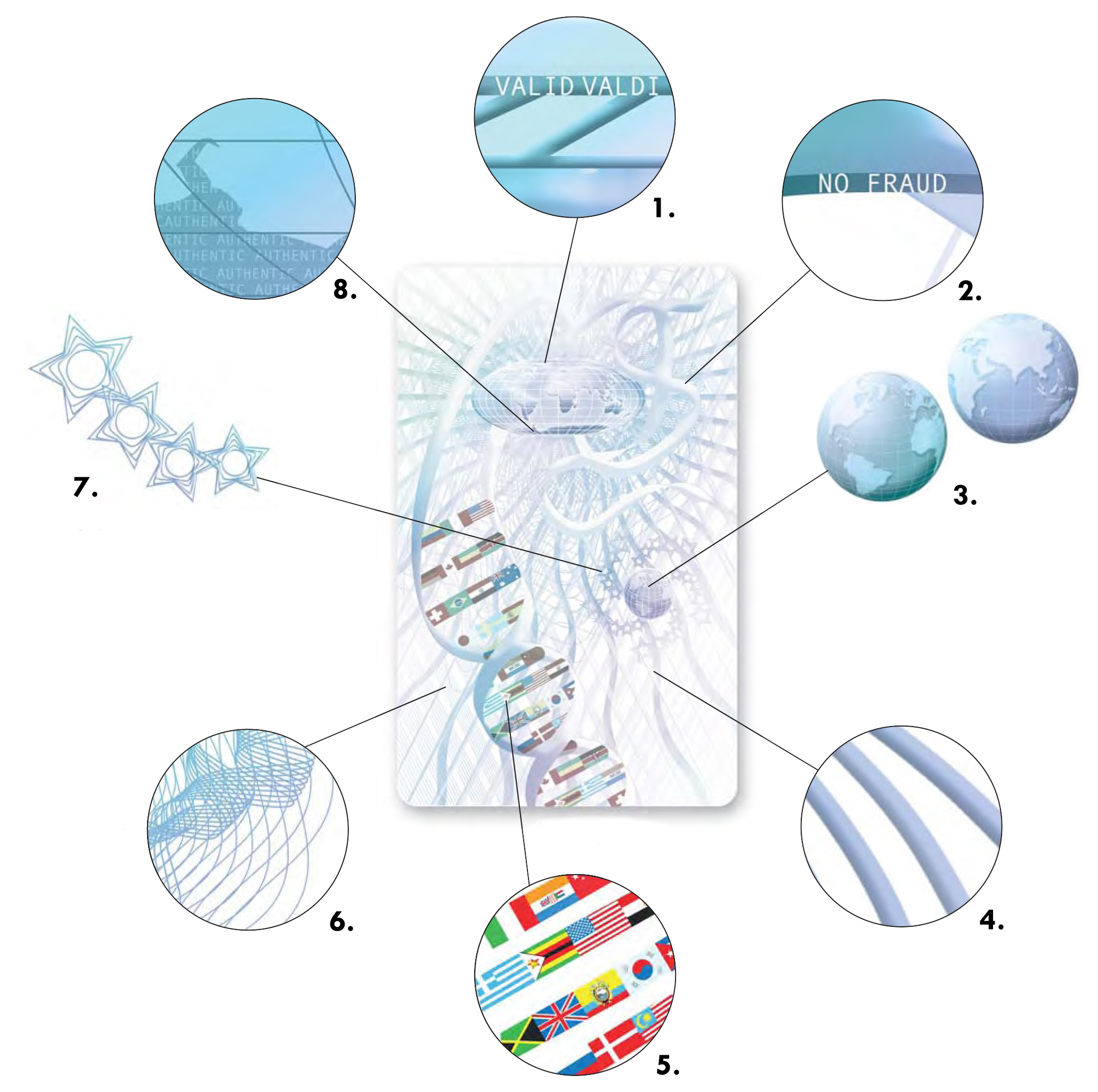 Below, the Standard World View image contains the word “VALID” which is placed on the top and bottom parts of the globe artwork. Note that designated areas have specific typographic errors, (VALDI). This provides even one more level of covert detail to assist in verification of authenticity. - Micro Text (shown enlarged 1000%)